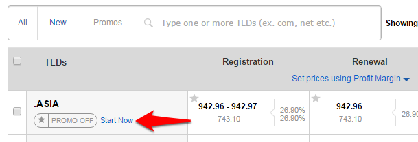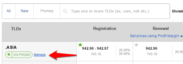 A green star indicates that a Promo is activated for a TLD for Registration, Renewal and/or Transfer.